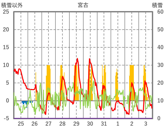 | 日 | 時 | 気温 | 降水 | 風向/風速 | 日照 | 積雪 | 降雪 |