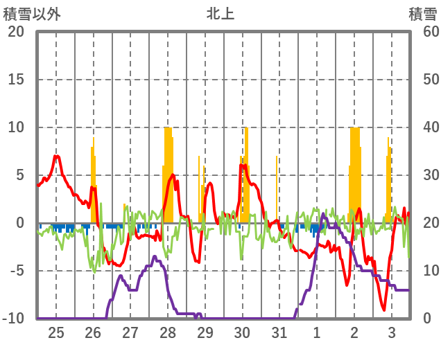 | 日 | 時 | 気温 | 降水 | 風向/風速 | 日照 | 積雪 | 降雪 |