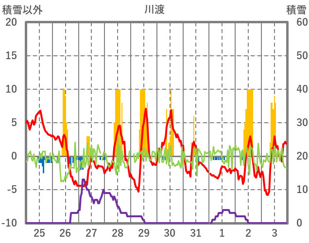 | 日 | 時 | 気温 | 降水 | 風向/風速 | 日照 | 積雪 | 降雪 |