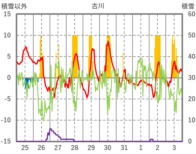 | 日 | 時 | 気温 | 降水 | 風向/風速 | 日照 | 積雪 | 降雪 |