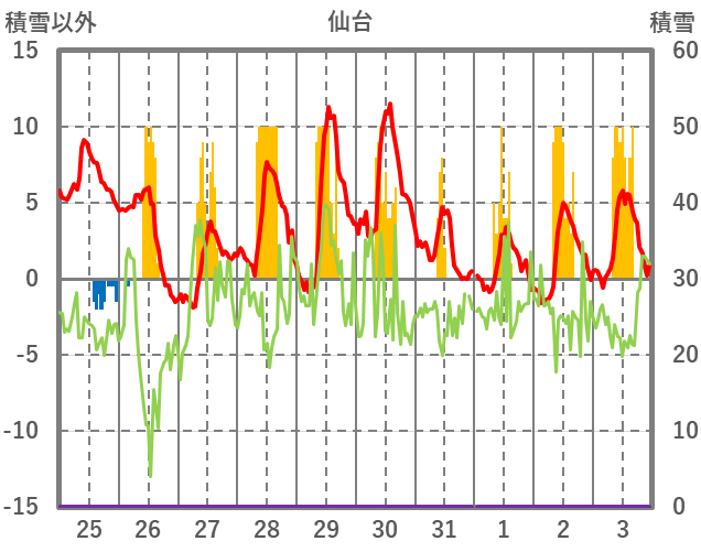 | 日 | 時 | 気温 | 降水 | 風向/風速 | 日照 | 積雪 | 降雪 |