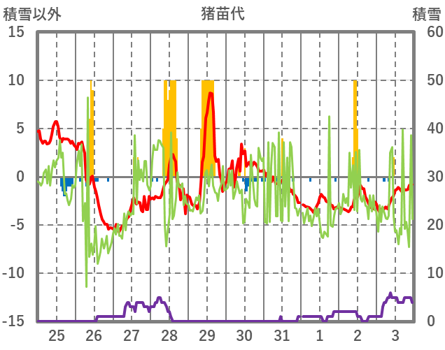 | 日 | 時 | 気温 | 降水 | 風向/風速 | 日照 | 積雪 | 降雪 |