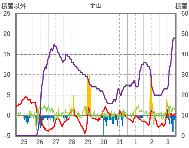 | 日 | 時 | 気温 | 降水 | 風向/風速 | 日照 | 積雪 | 降雪 |