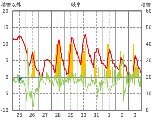 | 日 | 時 | 気温 | 降水 | 風向/風速 | 日照 | 積雪 | 降雪 |