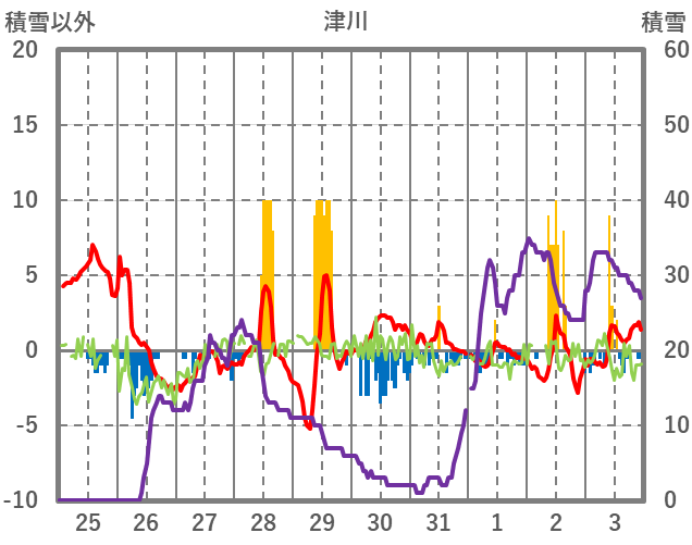 | 日 | 時 | 気温 | 降水 | 風向/風速 | 日照 | 積雪 | 降雪 |
