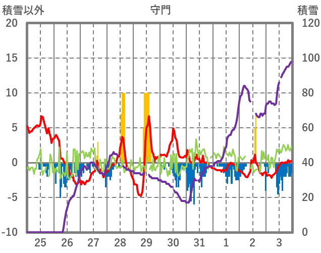 | 日 | 時 | 気温 | 降水 | 風向/風速 | 日照 | 積雪 | 降雪 |