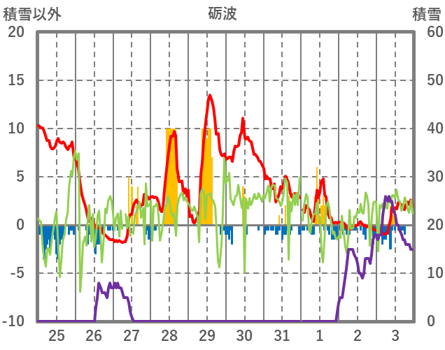 | 日 | 時 | 気温 | 降水 | 風向/風速 | 日照 | 積雪 | 降雪 |