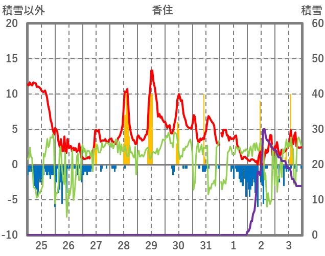 | 日 | 時 | 気温 | 降水 | 風向/風速 | 日照 | 積雪 | 降雪 |