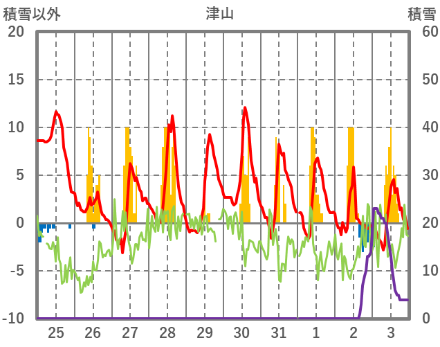 | 日 | 時 | 気温 | 降水 | 風向/風速 | 日照 | 積雪 | 降雪 |