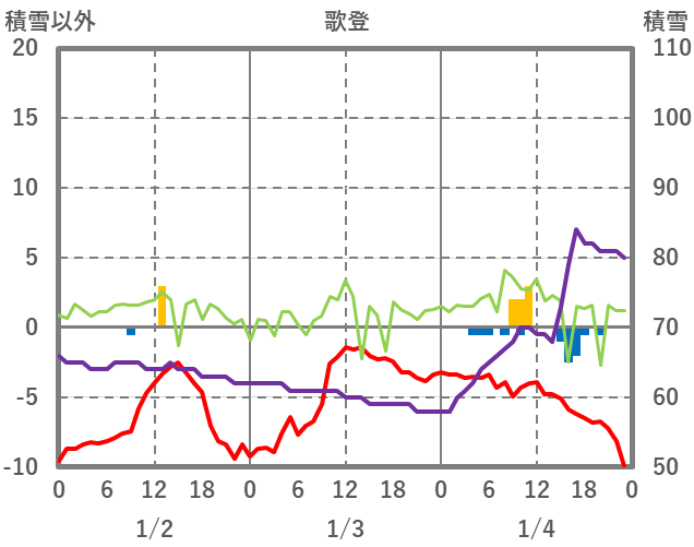 | 日 | 時 | 気温 | 降水 | 風向/風速 | 日照 | 積雪 | 降雪 |