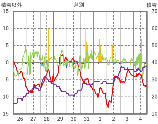 | 日 | 時 | 気温 | 降水 | 風向/風速 | 日照 | 積雪 | 降雪 |