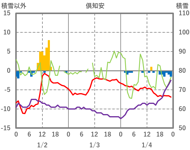 | 日 | 時 | 気温 | 降水 | 風向/風速 | 日照 | 積雪 | 降雪 |