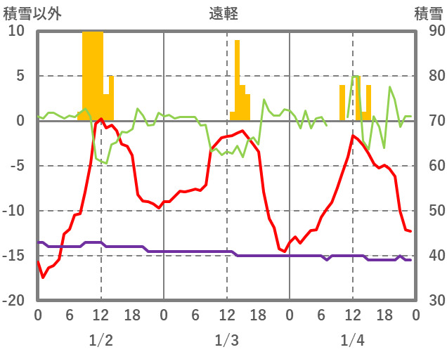 | 日 | 時 | 気温 | 降水 | 風向/風速 | 日照 | 積雪 | 降雪 |