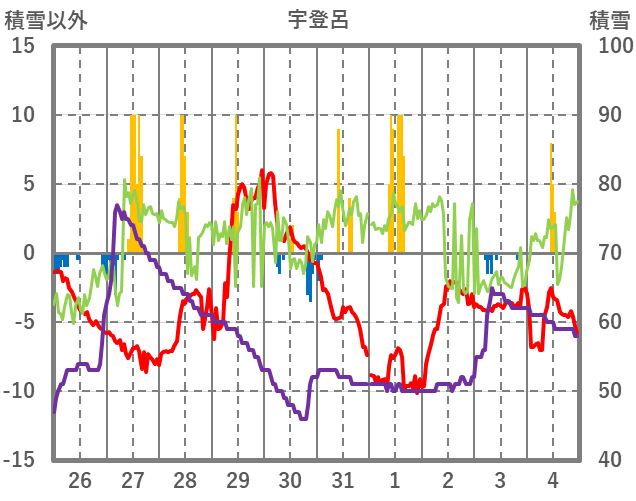 | 日 | 時 | 気温 | 降水 | 風向/風速 | 日照 | 積雪 | 降雪 |