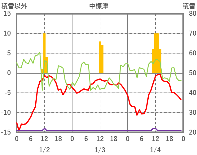 | 日 | 時 | 気温 | 降水 | 風向/風速 | 日照 | 積雪 | 降雪 |