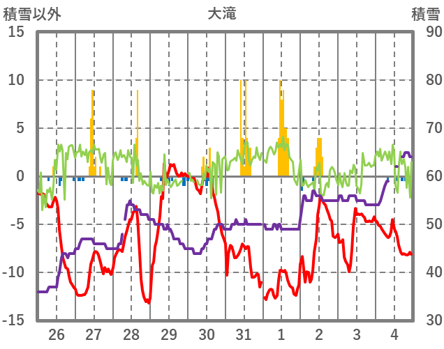 | 日 | 時 | 気温 | 降水 | 風向/風速 | 日照 | 積雪 | 降雪 |