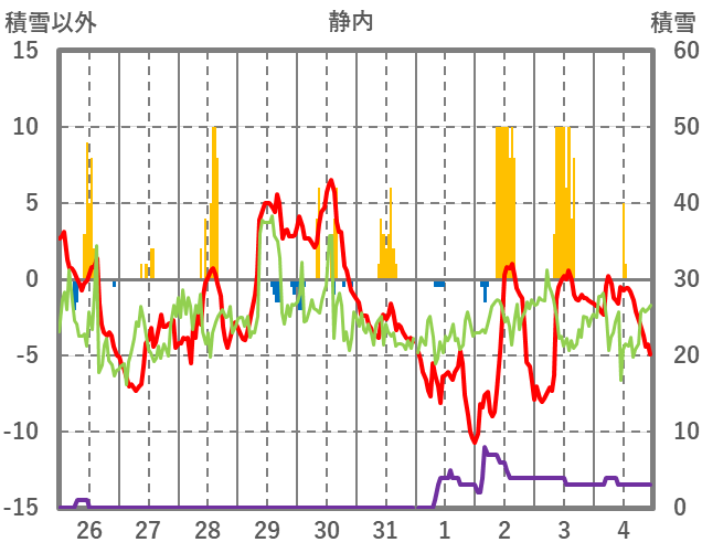 | 日 | 時 | 気温 | 降水 | 風向/風速 | 日照 | 積雪 | 降雪 |