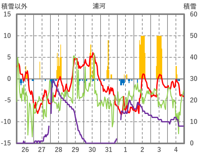 | 日 | 時 | 気温 | 降水 | 風向/風速 | 日照 | 積雪 | 降雪 |