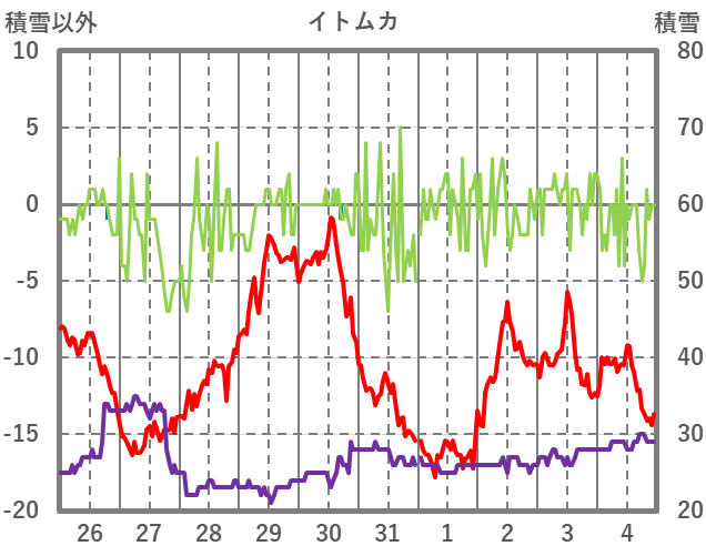 | 日 | 時 | 気温 | 降水 | 風向/風速 | 日照 | 積雪 | 降雪 |