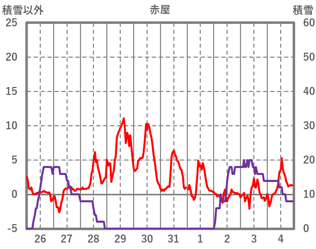 | 日 | 時 | 気温 | 降水 | 風向/風速 | 日照 | 積雪 | 降雪 |