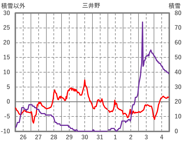 | 日 | 時 | 気温 | 降水 | 風向/風速 | 日照 | 積雪 | 降雪 |