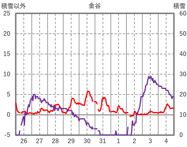 | 日 | 時 | 気温 | 降水 | 風向/風速 | 日照 | 積雪 | 降雪 |