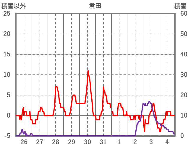 | 日 | 時 | 気温 | 降水 | 風向/風速 | 日照 | 積雪 | 降雪 |