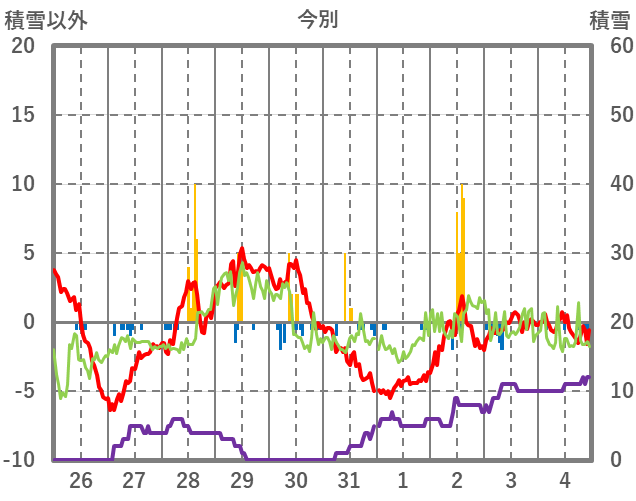 | 日 | 時 | 気温 | 降水 | 風向/風速 | 日照 | 積雪 | 降雪 |