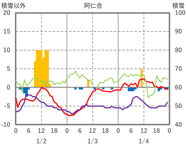 | 日 | 時 | 気温 | 降水 | 風向/風速 | 日照 | 積雪 | 降雪 |