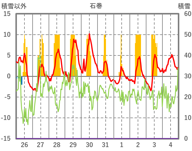 | 日 | 時 | 気温 | 降水 | 風向/風速 | 日照 | 積雪 | 降雪 |
