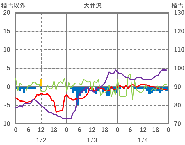 | 日 | 時 | 気温 | 降水 | 風向/風速 | 日照 | 積雪 | 降雪 |