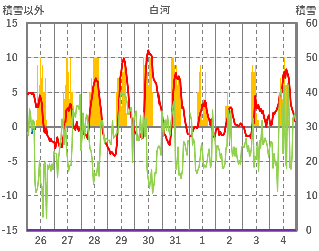 | 日 | 時 | 気温 | 降水 | 風向/風速 | 日照 | 積雪 | 降雪 |