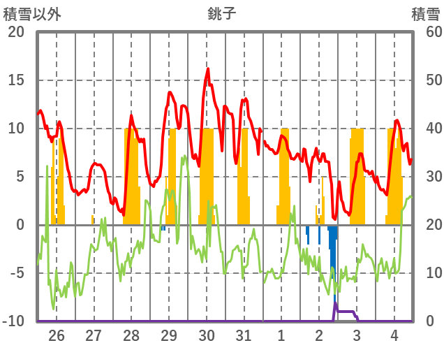 | 日 | 時 | 気温 | 降水 | 風向/風速 | 日照 | 積雪 | 降雪 |