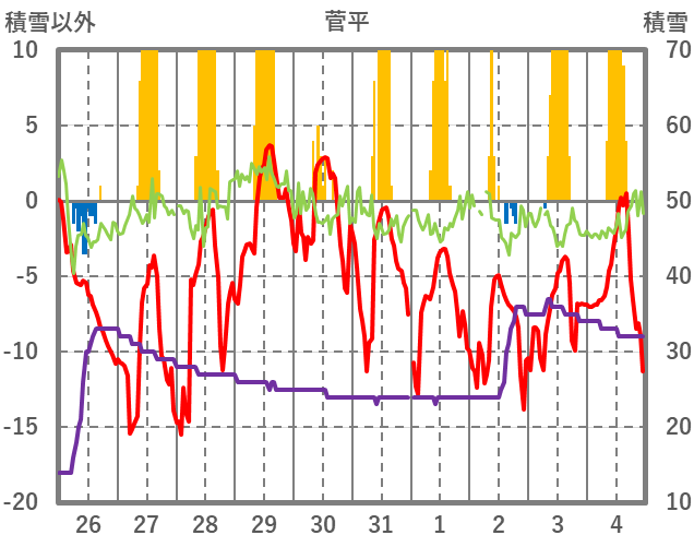 | 日 | 時 | 気温 | 降水 | 風向/風速 | 日照 | 積雪 | 降雪 |