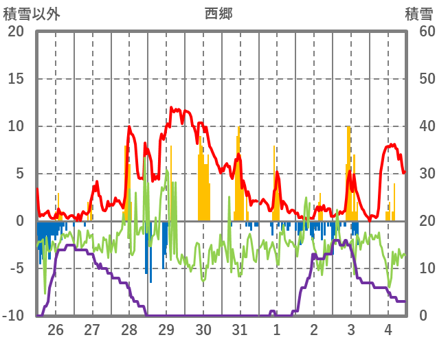 | 日 | 時 | 気温 | 降水 | 風向/風速 | 日照 | 積雪 | 降雪 |