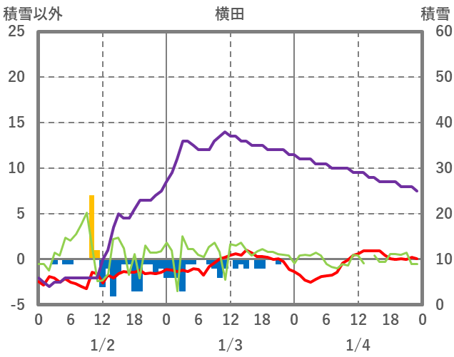 | 日 | 時 | 気温 | 降水 | 風向/風速 | 日照 | 積雪 | 降雪 |