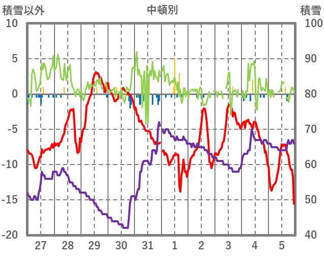 | 日 | 時 | 気温 | 降水 | 風向/風速 | 日照 | 積雪 | 降雪 |