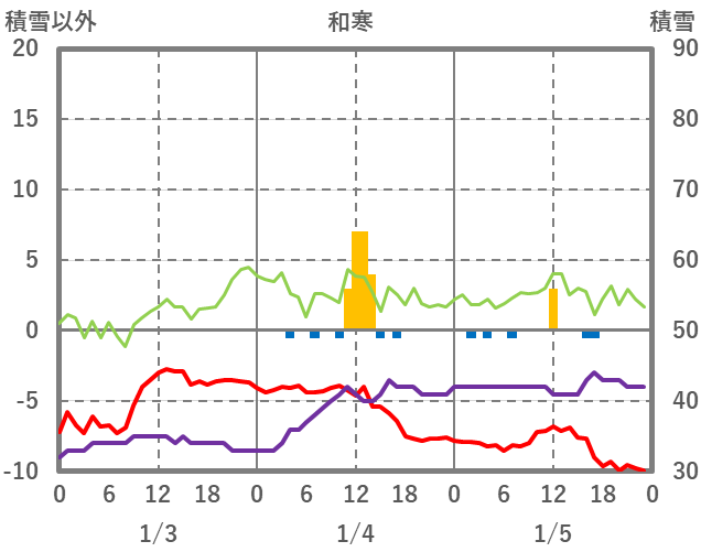 | 日 | 時 | 気温 | 降水 | 風向/風速 | 日照 | 積雪 | 降雪 |