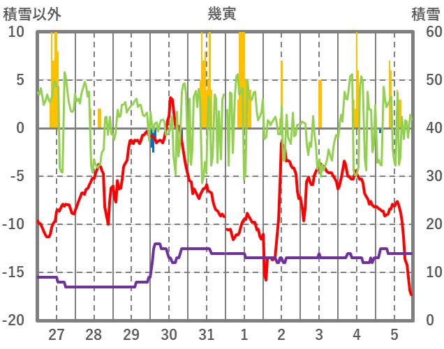 | 日 | 時 | 気温 | 降水 | 風向/風速 | 日照 | 積雪 | 降雪 |