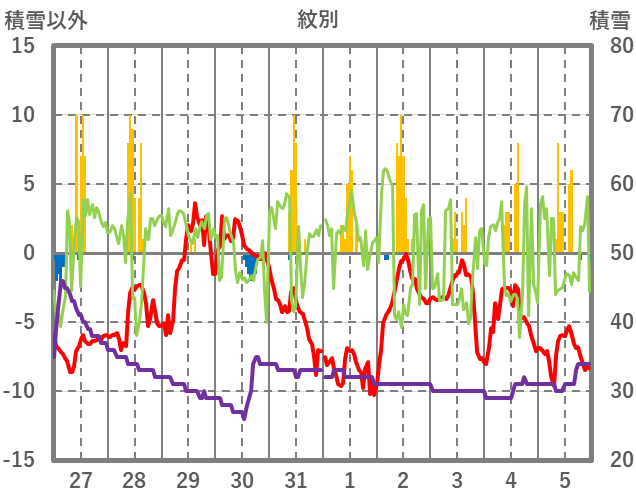 | 日 | 時 | 気温 | 降水 | 風向/風速 | 日照 | 積雪 | 降雪 |