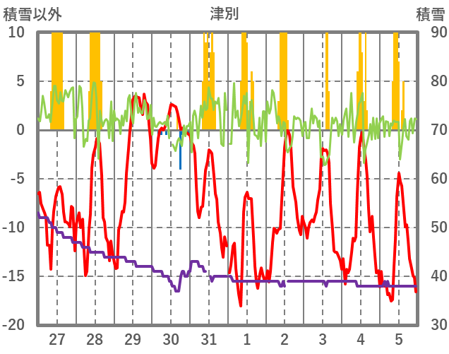 | 日 | 時 | 気温 | 降水 | 風向/風速 | 日照 | 積雪 | 降雪 |