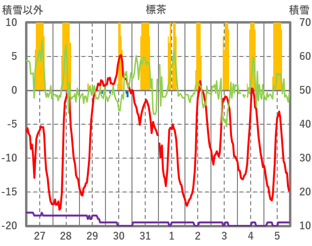 | 日 | 時 | 気温 | 降水 | 風向/風速 | 日照 | 積雪 | 降雪 |