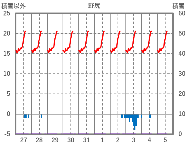 | 日 | 時 | 気温 | 降水 | 風向/風速 | 日照 | 積雪 | 降雪 |