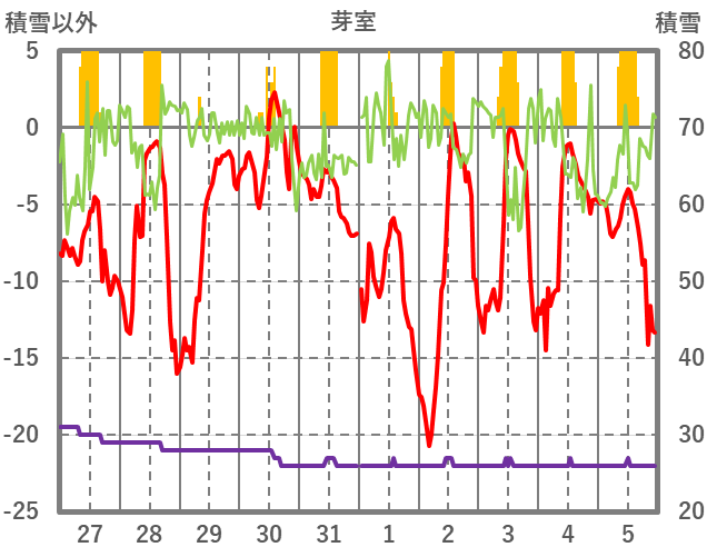 | 日 | 時 | 気温 | 降水 | 風向/風速 | 日照 | 積雪 | 降雪 |