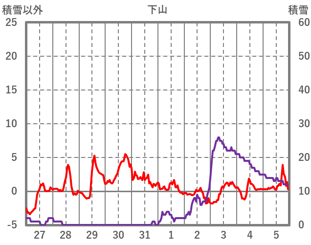 | 日 | 時 | 気温 | 降水 | 風向/風速 | 日照 | 積雪 | 降雪 |