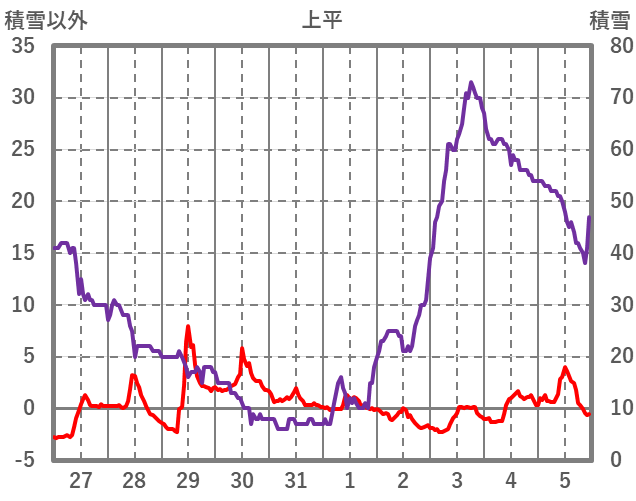 | 日 | 時 | 気温 | 降水 | 風向/風速 | 日照 | 積雪 | 降雪 |