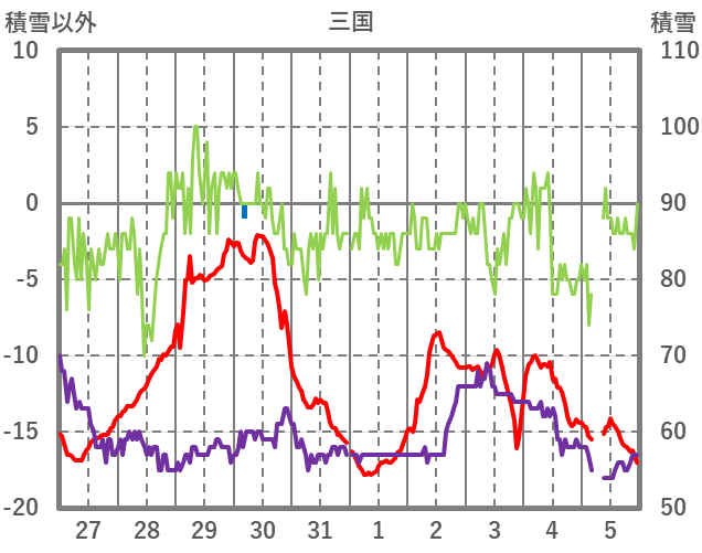 | 日 | 時 | 気温 | 降水 | 風向/風速 | 日照 | 積雪 | 降雪 |