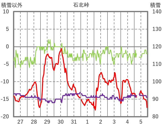 | 日 | 時 | 気温 | 降水 | 風向/風速 | 日照 | 積雪 | 降雪 |