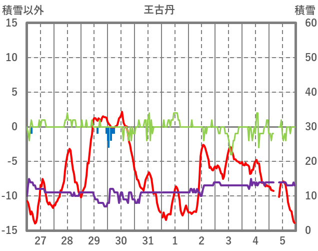 | 日 | 時 | 気温 | 降水 | 風向/風速 | 日照 | 積雪 | 降雪 |