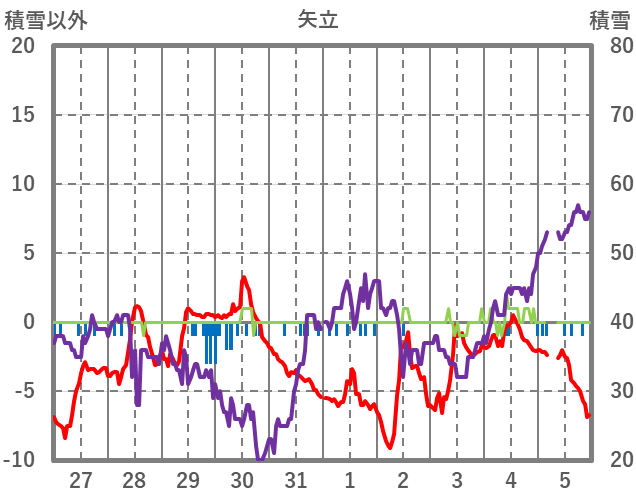 | 日 | 時 | 気温 | 降水 | 風向/風速 | 日照 | 積雪 | 降雪 |